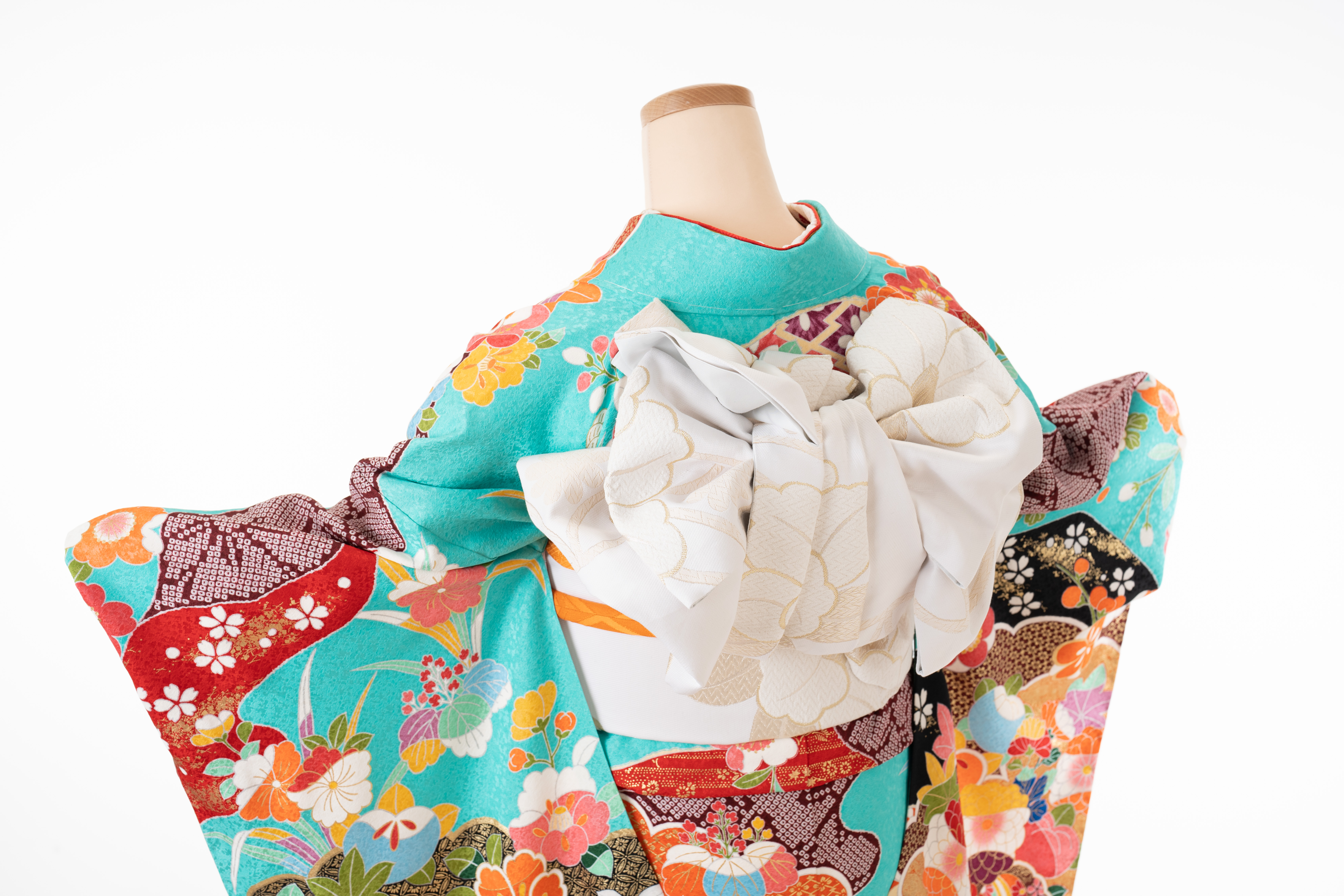 上前には、「牡丹文様」。牡丹は小さな蕾から大輪の花を咲かせることで百花の王と呼ばれ、高貴・豪華絢爛・幸福といった意味があります。牡丹の側には「椿文様」。椿は、永遠の美・気取らない美しさ・申し分のない魅力や厄除けといった意味があります。そしてお裾には「雲取り文様」。雲は龍や神の住処とも言われ、神聖な意味が込められています。雲は雨を呼ぶため豊作をもたらし良い事が起こる前兆としておめでたい着物の文様になりました。沢山のおめでたい文様に包まれ、新しい門出にふさわしい振袖です。