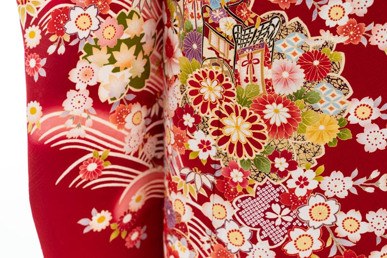 上前には水の流れる様子を表す「流水文様」。流水柄は流れのある水は腐らない事から清らかさを表し、また流れる様子から厄が流れると言う意味もあります。そして高貴で典雅な雰囲気を演出する「御所車」。金駒繍で縁取りされているのは邪気を払う「菊文様」。華やかで輝かしい未来を表す「桜文様」も咲き誇り、新しい門出にぴったりの振袖です。