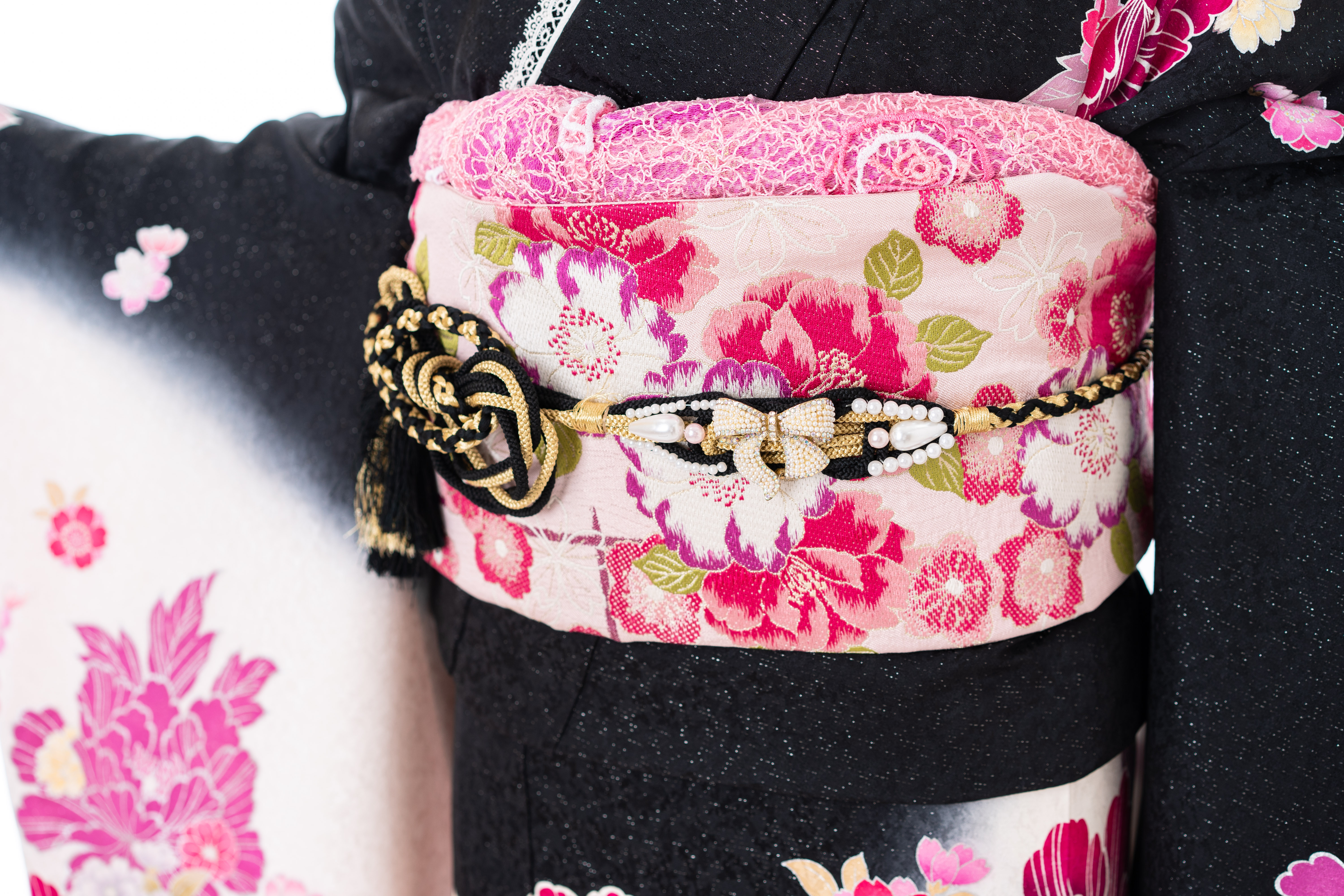 桜が描かれた,ピンク地の可愛い帯を合わせています。