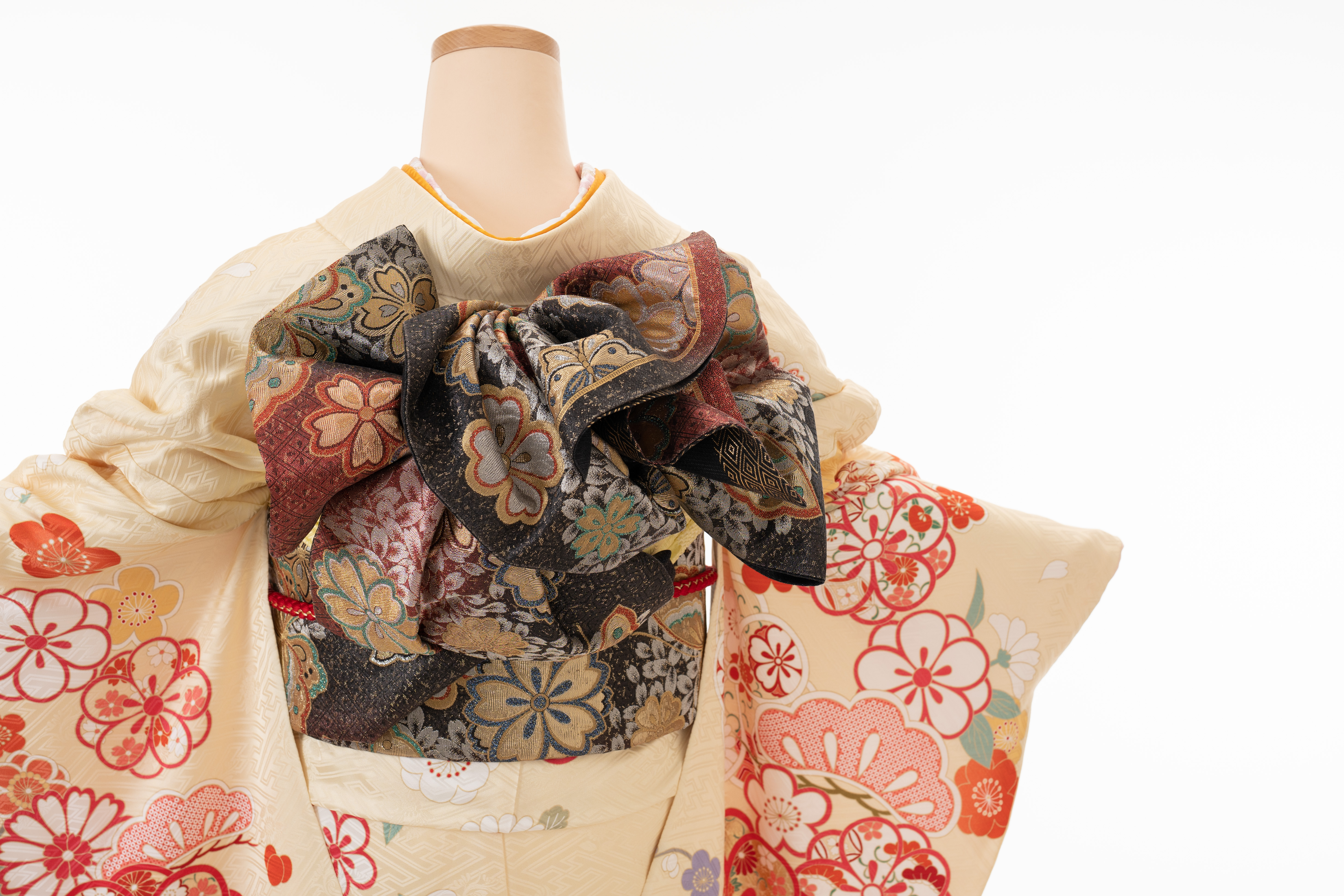 桜と蝶柄が描かれた、赤と黒のグラデーション地の帯を合わせております。