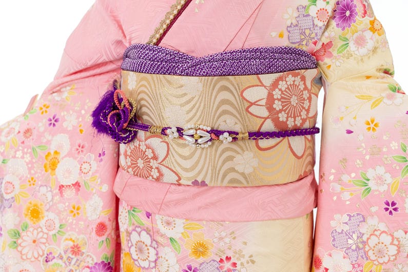 「紗綾形」が地模様のピンク地に薄黄色のグラデーションが可愛らしく華やかな印象に☆