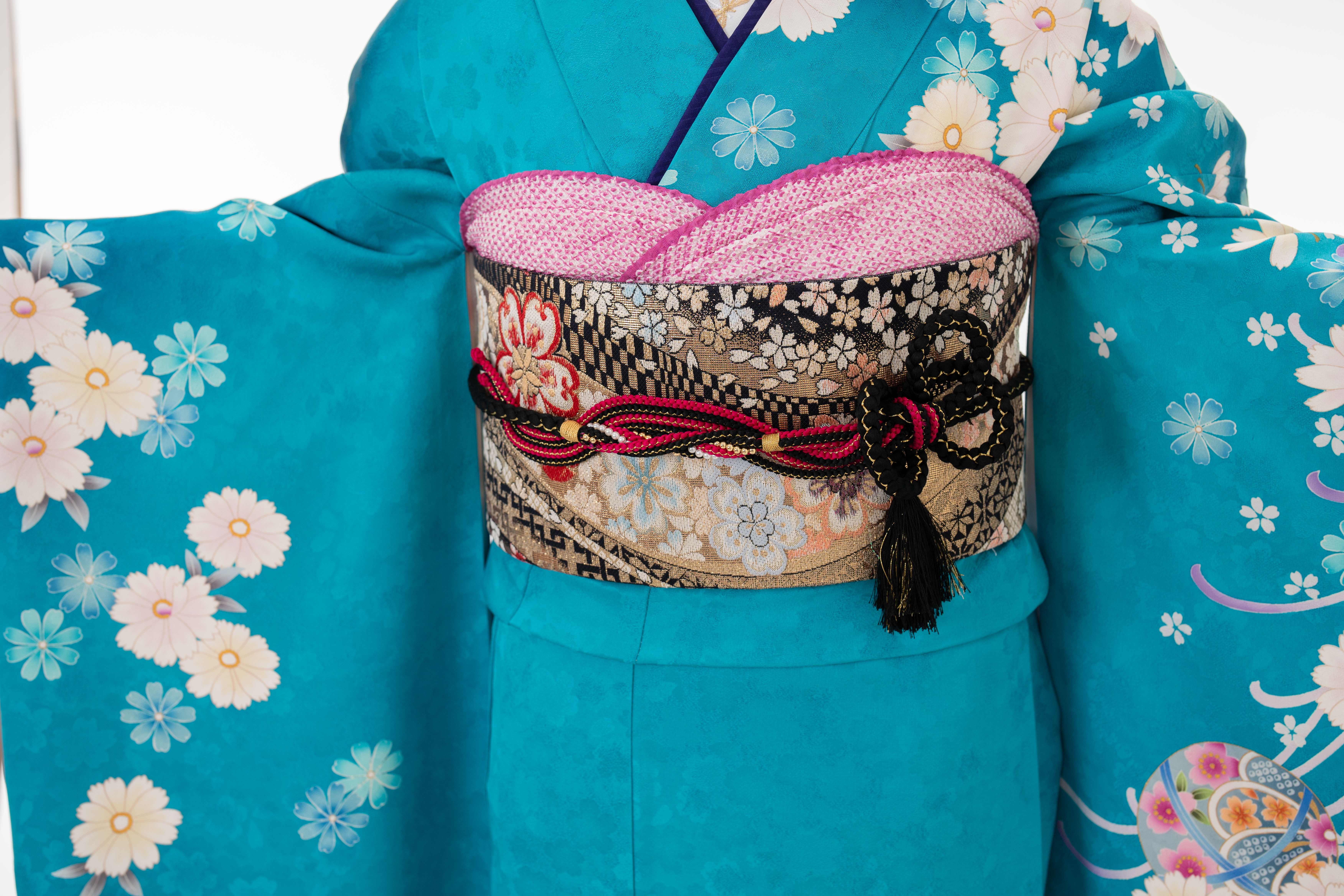 上前には、コスモス柄と「鞠文様」。鞠は、何事も丸く収まるように、円満な家庭が築けるようにと言う願いが込められています。また、毱を作る際に使う糸が長いことから良縁を結べるようにと言う願いや元々、貴族の遊びであった蹴鞠であったことから品の良さを表すと言う意味もあります。振袖は個性的に可愛く着こなしたい方にはおすすめの振袖です。