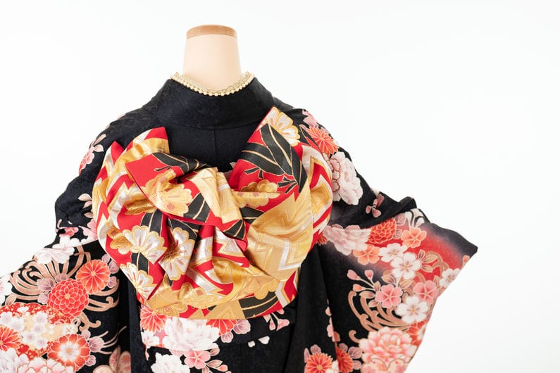 松葉菱や竹柄が描かれた、赤地の帯を合わせております。