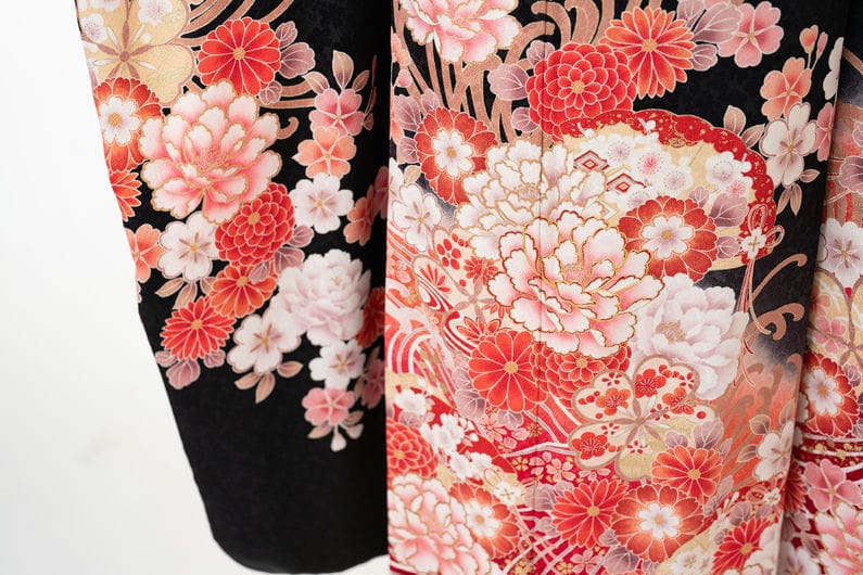 上前には、金駒繍で縁取られた「牡丹文様」。牡丹は小さな蕾から大輪の花を咲かせることで百花の王と呼ばれ、幸福・豪華絢爛・高貴といった意味があります。牡丹柄の側には「扇文様」。扇は、広がった形から末広がりに運気が良くなる 、将来の展望が明るいということを表す発展や栄光を象徴する文様です。 そして、 お裾には水が流れる様子を表した「流水文様」。流れのある水は腐らないことから清らかさを表し、流れる様子から厄が流れると言う意味があります。華やかな輝かしい未来を表す「桜文様」も描かれ新しい門出にオススメの振袖です。