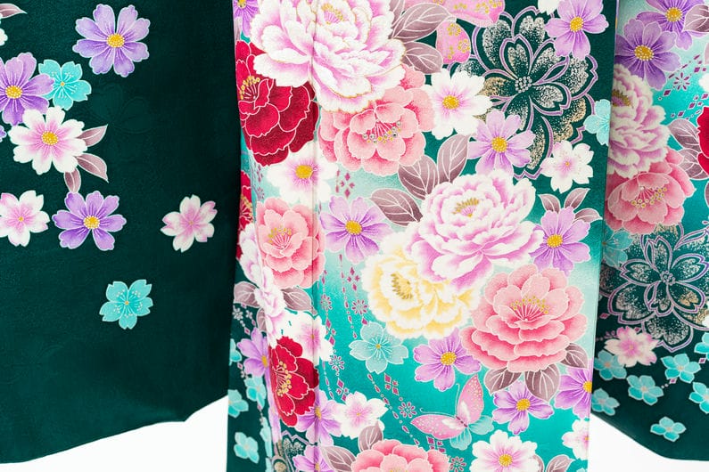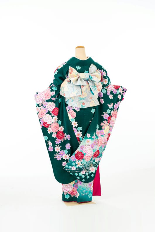上前には、色取り取りに描かれた「桜文様」。さくらの「さ」は稲や田んぼの神を表し「くら」は倉・蔵・鞍など座するところを表します。日本人にとってのさくらの文様とは、五穀豊穣を願った吉祥文様でもあります。また、毎年美しく咲き誇る姿から華やかさや繁栄を意味します。そして、桜と共に描かれているのは「蝶文様」。芋虫からさなぎ 、優雅な蝶に成長し羽ばたく姿から吉兆の象徴とされ、縁起の良い柄と言われます。春の新しい門出におすすめの振袖です。