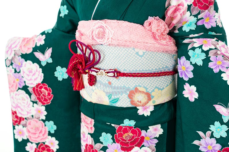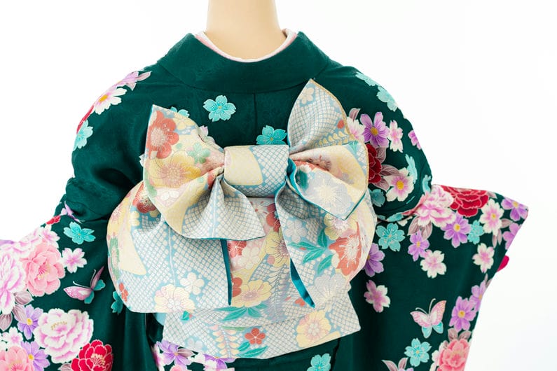 扇や桜・藤が描かれた、水色地の帯を合わせております。